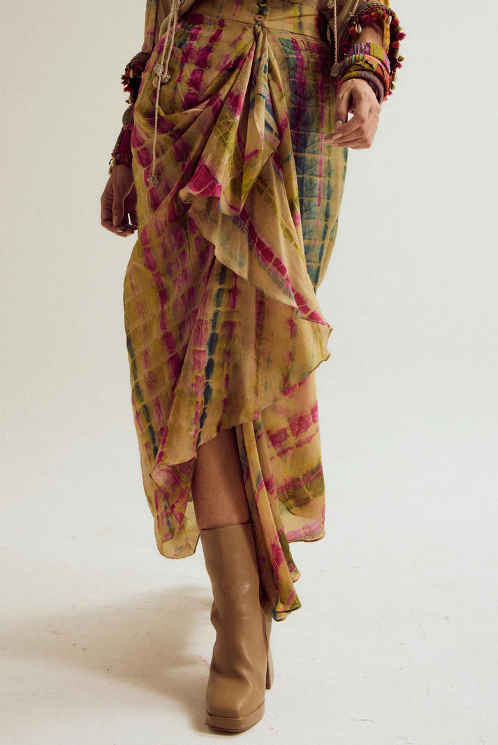A striking two-piece ensemble combining intricate detailing with fluid movement. The front-open hi-low Alicia Shirt features a distinctive double collar with threadwork hand embroidery on the collars and cuffs, finished with tassel accents along the sleeves. It pairs with the Dahlia uneven-hem skirt in a soft tie-dye finish, offering a perfect balance of structure and flow for versatile day-to-evening elegance.