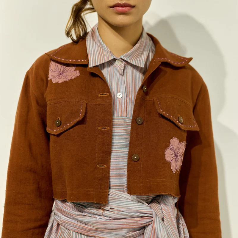 A playful and versatile piece, this crop shirt is crafted in Kala cotton naturally dyed in brown. Designed with a front flap placket and long sleeves, it features appliqué floral embroidery along with delicate hand embroidery on the collar and pocket flap for a refined artisanal touch. Its short, regular fit makes it perfect for layering or pairing with high-waist bottoms, offering effortless style for casual outings or relaxed occasions.