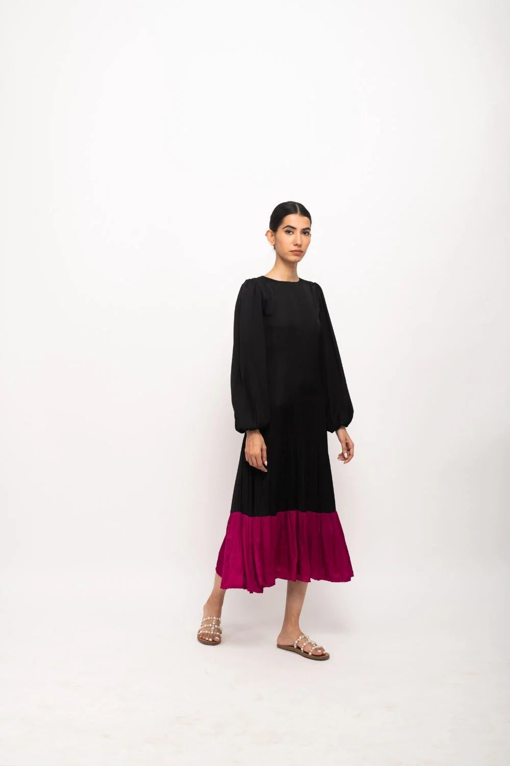 Presenting a sophisticated Black-Wine maxi dress adorned with full sleeves and elegant wine gathers at the cuffs. This ensemble exudes timeless grace and refinement, ideal for making a chic statement at formal gatherings or elegant evenings out.