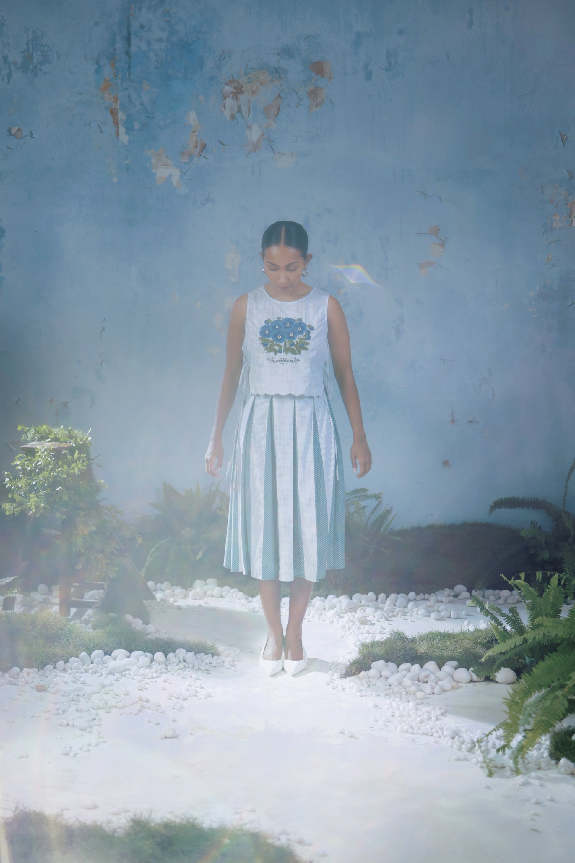 A scalloped crop top in fine line checks, finished with side-tie knots and a hand embroidered, vintage pansy motif. A poetic nod to the whimsy blooming within the concrete jungle of dreams. A pleated skirt cut in dual weaves of fine-line checks and pinstripes, layered in contrast and movement. It carries the raw edge and rhythm of Brooklyn, and the memory of its creative pulse that gives it its name.