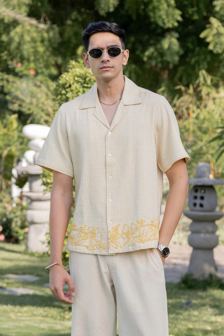 Perfect for warm-weather dressing, this designer summer shirt features a clean silhouette with detailed stitchwork that adds a unique, artisanal feel. Whether you're styling it solo or layering it for an off-duty look, this statement shirt for men brings versatility and sophistication to everyday wear. Ideal for city days, creative workspaces, or vacation evenings, the chic embroidered shirt is your new go-to for modern expression with a tailored edge
