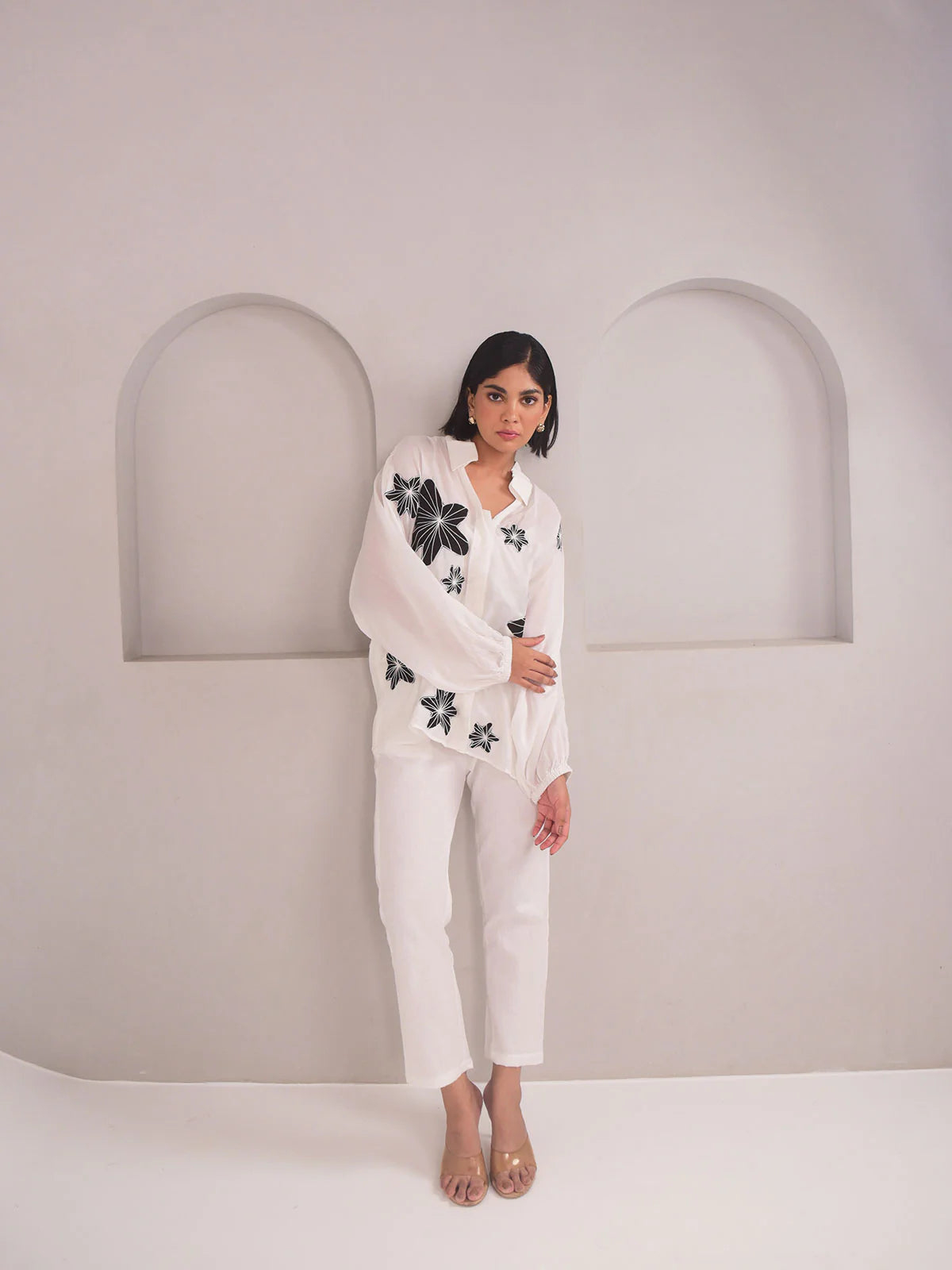 This set is a beautifully balanced ensemble that celebrates contrast and craft. The oversized shirt is tailored in soft, breathable modal viscose, with striking black flower appliques hand-placed across the shirt. It comes layered with a mul cotton slip for ease and opacity. The look is complete with narrow cotton-linen pants in matching white, designed with pockets and a clean, tailored fit. Style this set with or bold silver jewelry for an elevated daytime outfit.