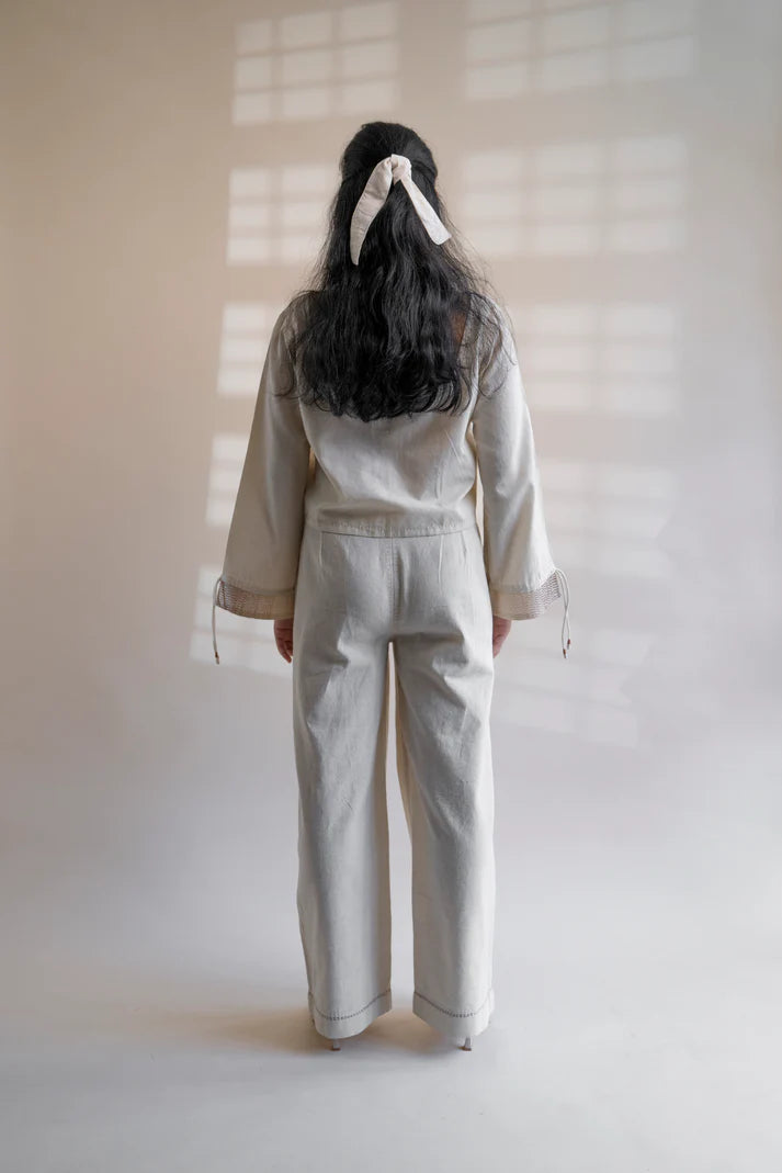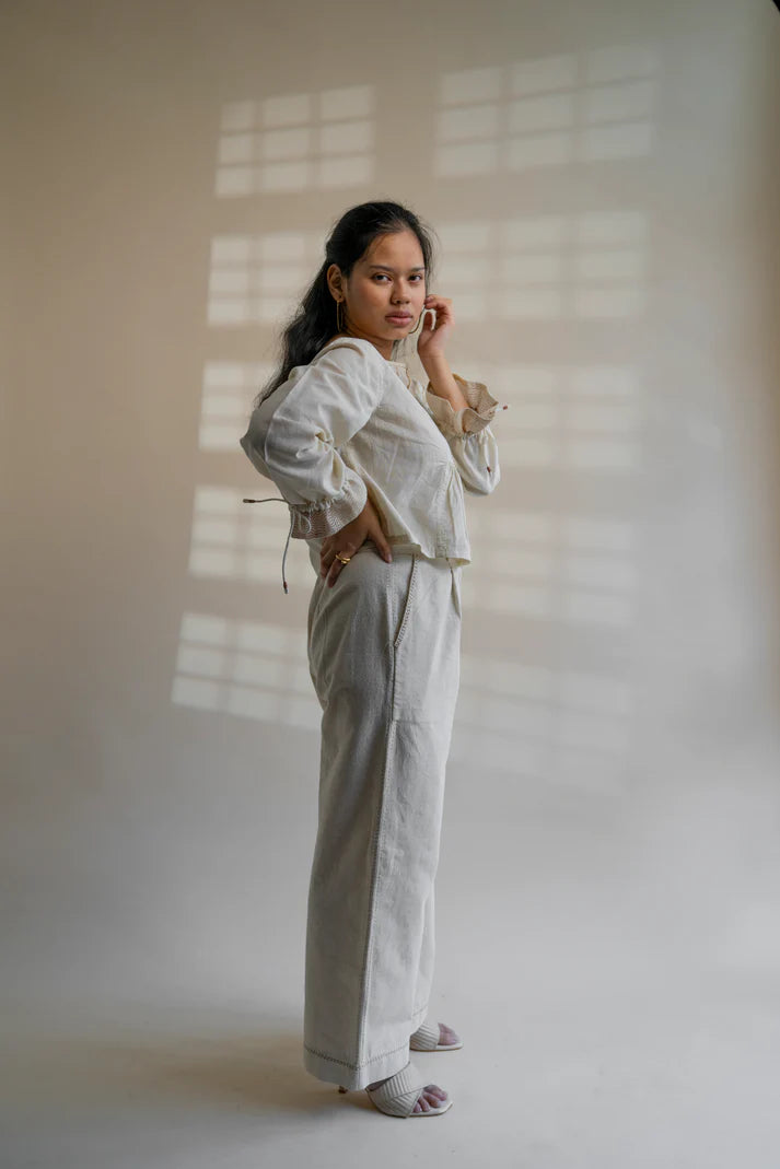 Crafted in 100% organic cotton fibres and natural materials. This 30s cotton straight leg pant is undyed and unbleached. These high-rise pants are a staple piece for any wardrobe. It comes with pleat and notch details making more room for comfort.