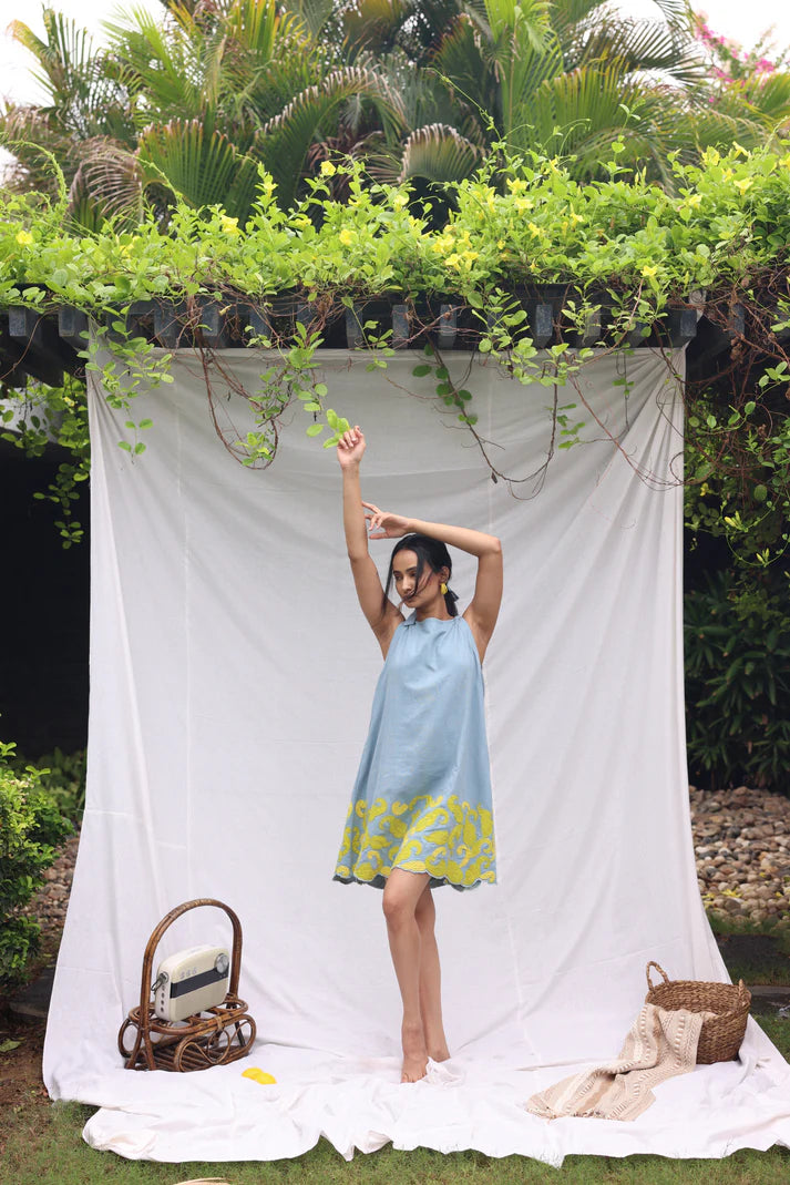 Elevate your summer wardrobe with Orange At Eight's Limoncello Diana Dress, featuring intricate lemon appliqué work and a flattering A-line fit. This elegant summer dress combines effortless style with classy design work, perfect for beach vacations, garden parties, and resort wear. Designed in pure kala cotton fabric, breathable fabric, the Limoncello Diana Dress offers a refreshing take on vacation fashion with a feminine silhouette. Discover the perfect lemon appliqué dress for sun-soaked days and chic evening