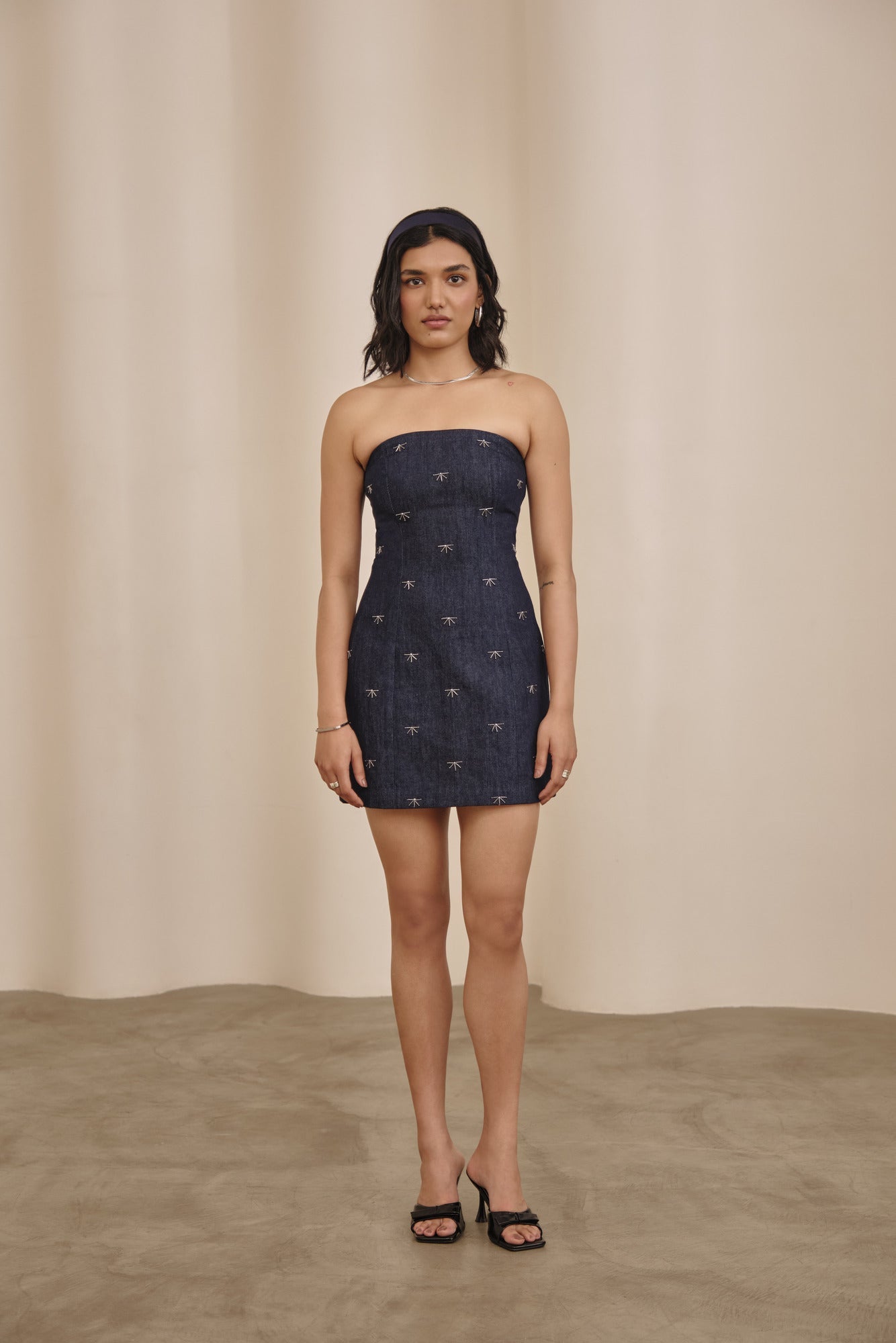 this strapless mini in embroidered indigo denim brings the right balance of fun and finesse. the fit is sharp, the attitude relaxed, and the mood - unmistakably confident