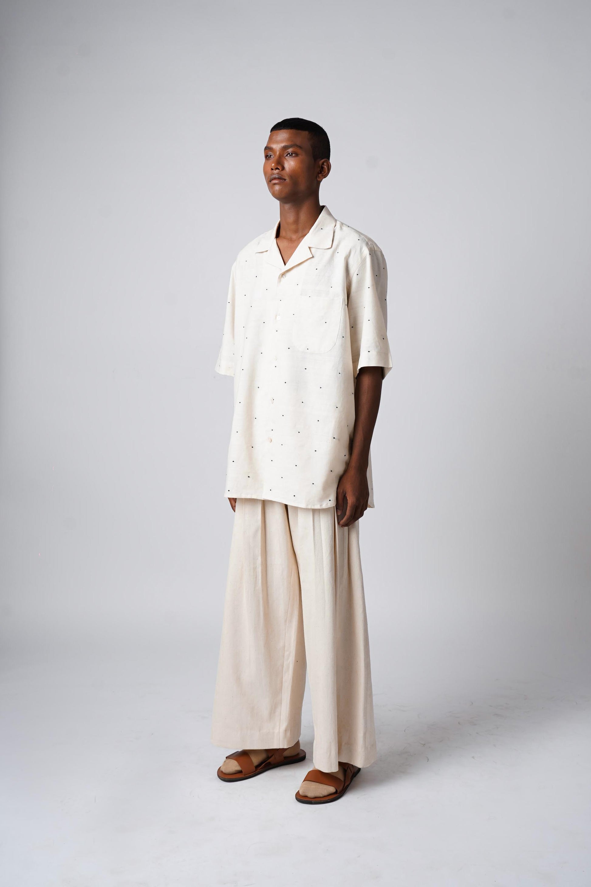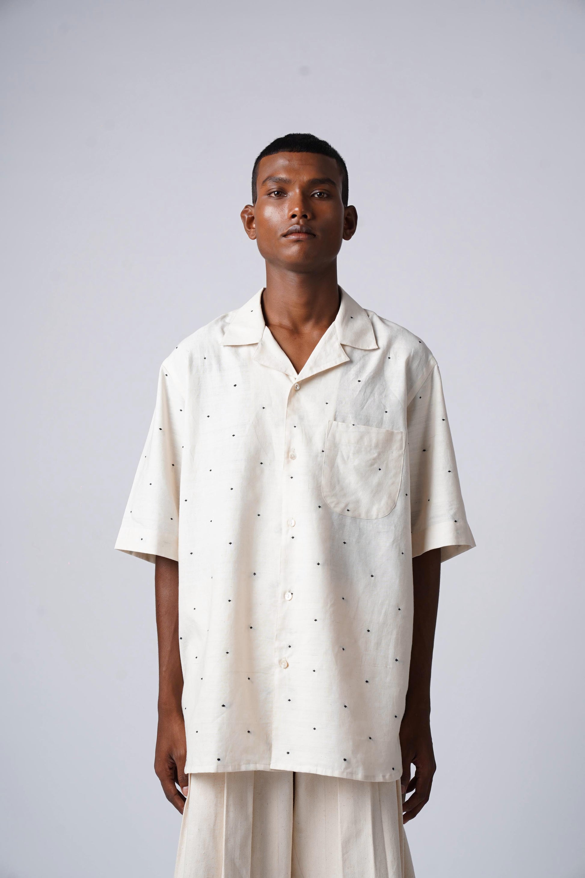 Experience contemporary craftsmanship with our Expressive Camp Collar Shirt, meticulously designed for effortless style and comfort. Crafted from premium fabric, this shirt features a relaxed camp collar that enhances its laid-back sophistication. The subtle yet striking small black extra-weft designs add texture and depth, celebrating artisanal detailing in a modern silhouette. Lightweight and versatile, it transitions seamlessly from casual outings to elevated occasions, making it a refined essential for the modern wardrobe.