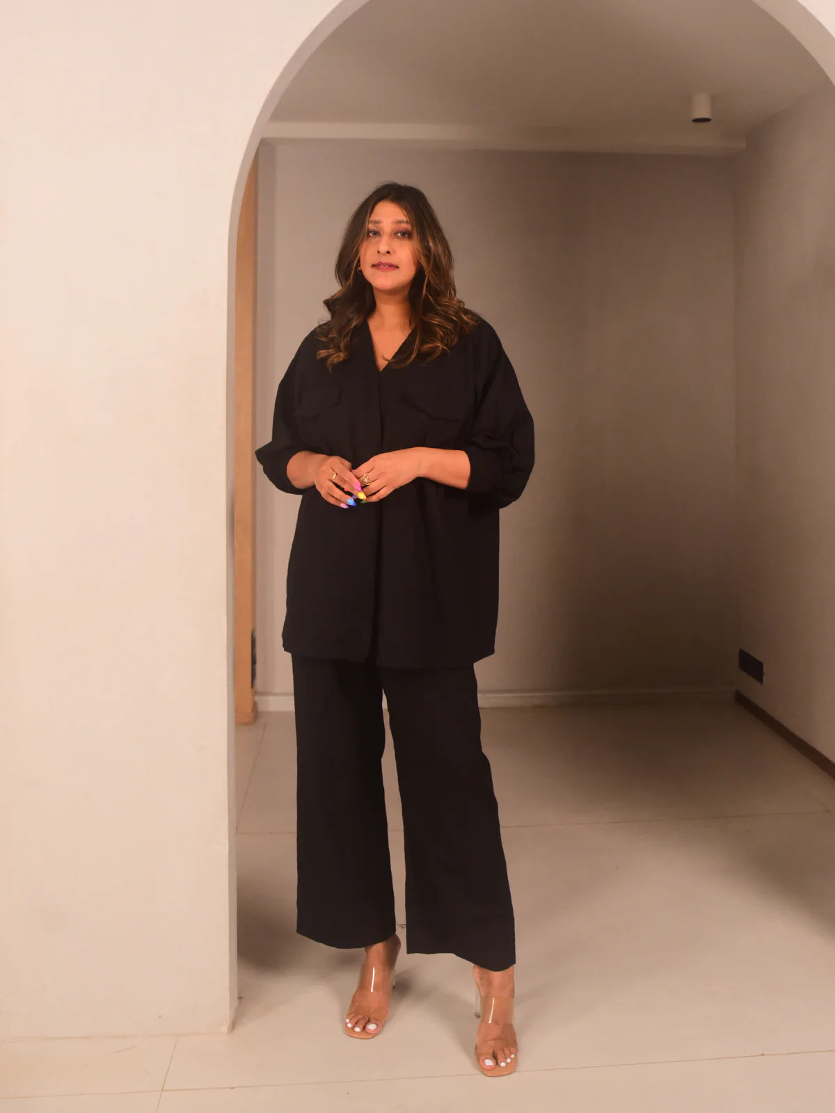 This black cotton-linen shirt redefines workwear ease with an oversized silhouette, V-neckline, and dolman sleeves with elasticated cuffs. The soft drape and modern cut make it a go-to wardrobe essential. Tuck in just one side for an effortless asymmetrical look or wear over slim-fit pants.Perfect for team huddles, creative spaces, or smart-casual dress codes.