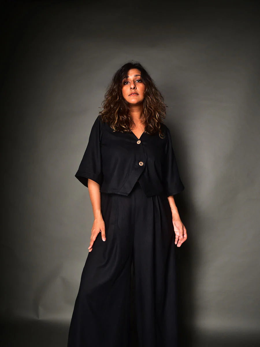 This shirt-meets-blouse is a touch of elegance for your staples. Cut in black cotton, it has flared sleeves and loose bodice. An overlapping placket in the front complete with wooden buttons. Cut in black rayon cotton, the pants have pleats in the front, with elastic at the back for elegance and comfort. Add to the glam with gold studs and statement pumps.