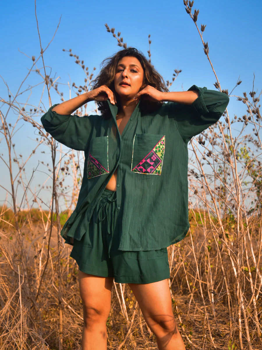 This oversized shirt is made for desk to dinner, cut in deep green cotton with contrast patchwork pockets. Pair with our Nina Shorts and sneakers to complete the lounge look.