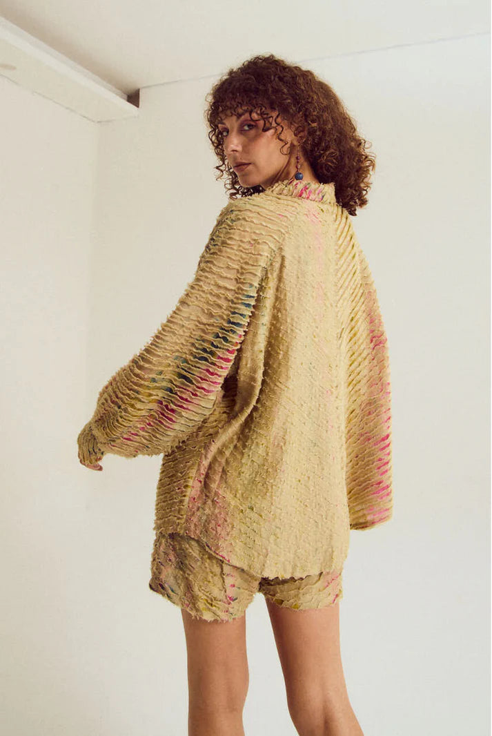 A breezy, textured co-ord in luxurious Chanderi silk. The front-open shirt features relaxed raglan sleeves with cuffs for an easy yet refined silhouette, while the matching shorts offer a flattering fit with a structured front belt and back elastic for comfort. Finished in a soft ecru tie-dye, this versatile set moves effortlessly from casual daywear to elevated evening style.