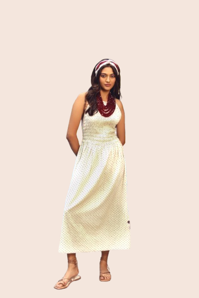 - Dress with a ruched front and an open back fastened with ties, offering a stylish and comfortable fit.