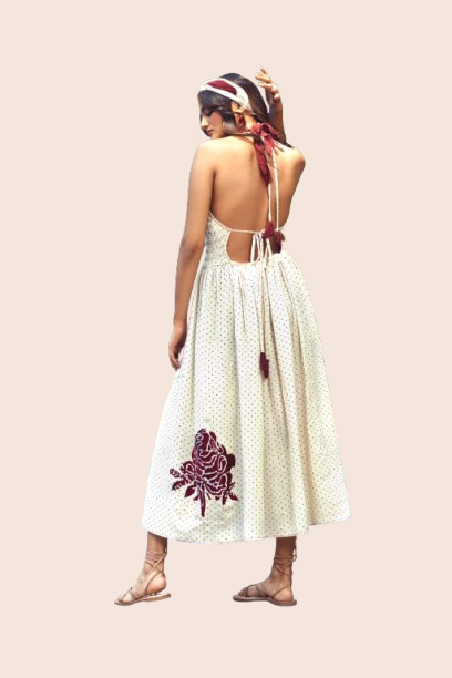 - This flowing dress features a delicate rose design embroidered on the right side, adding a touch of elegance to its design.