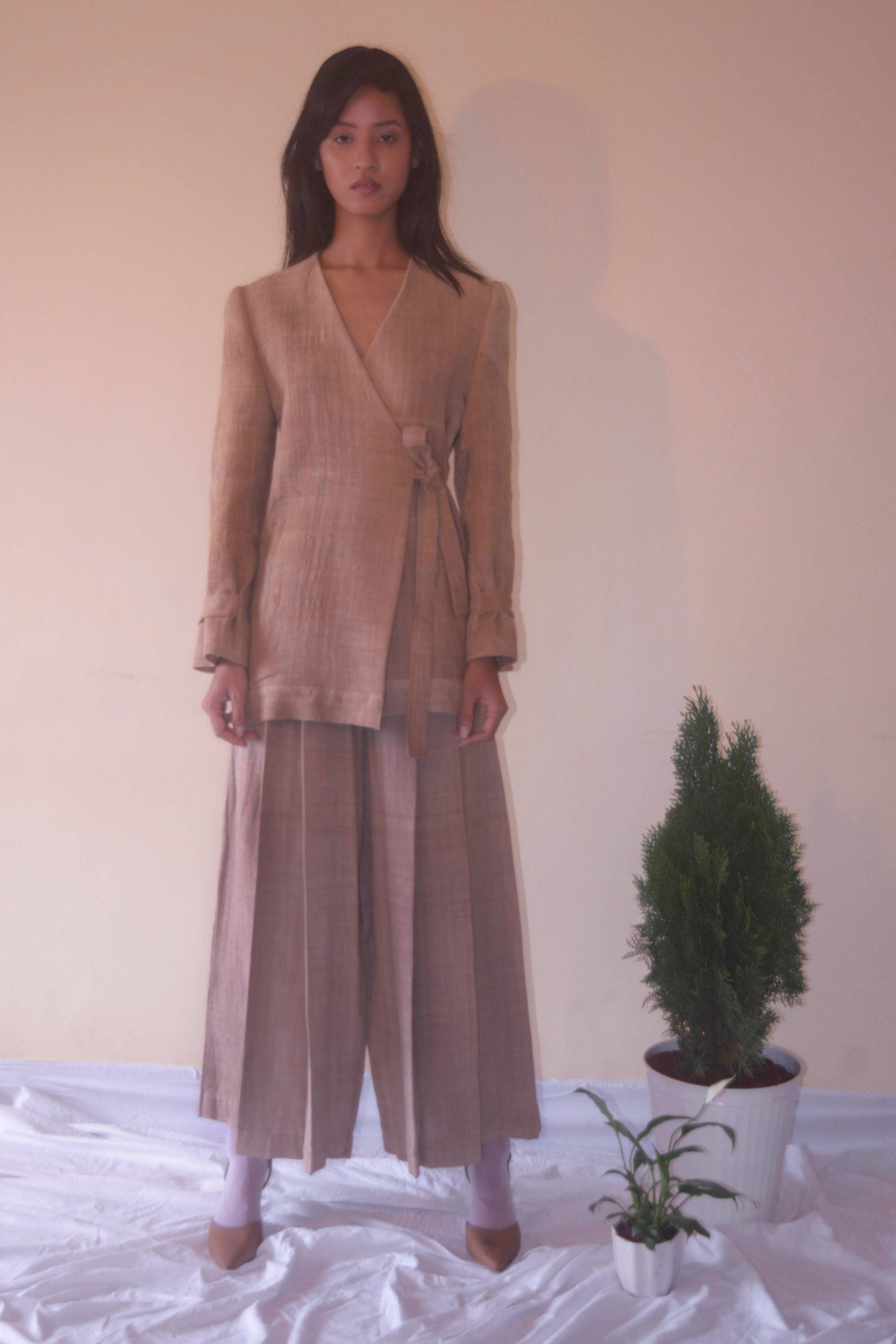 Tea dyed Handwoven Eri Silk Jacket with wrap-over tie-up detail