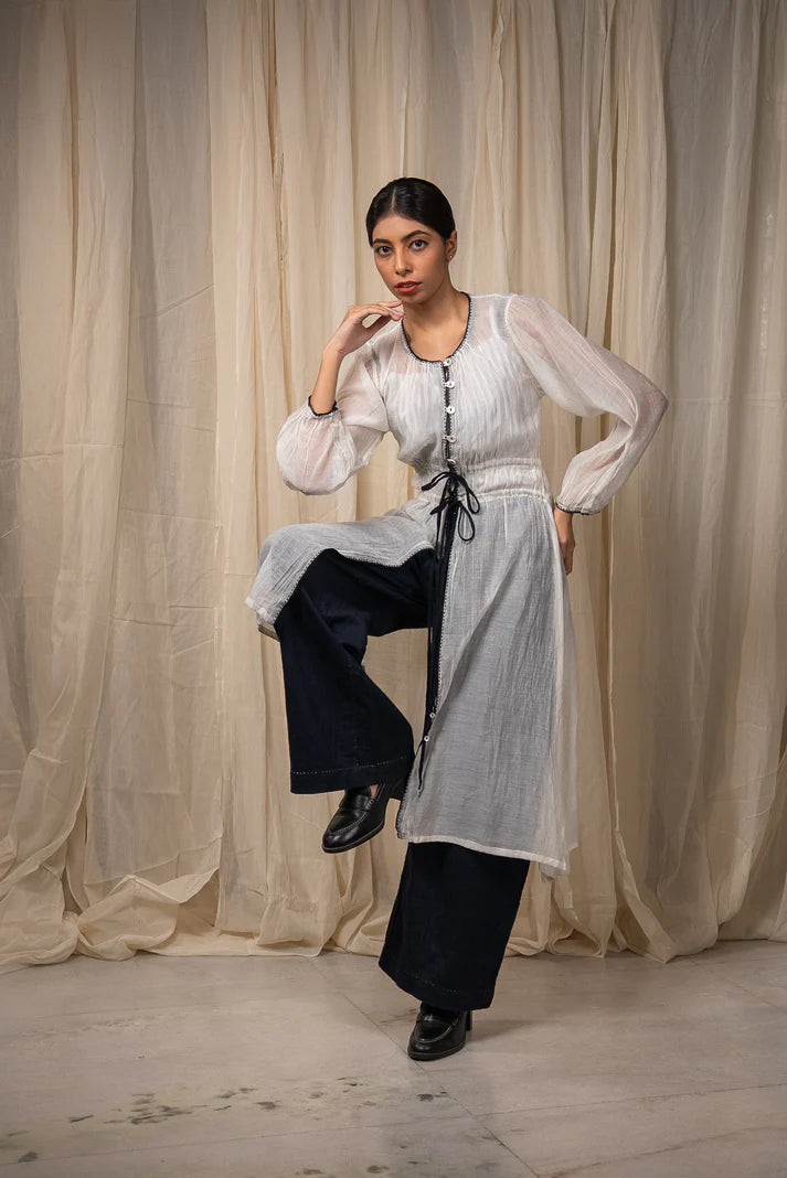 Made from 100% Handwoven Chanderi, this sheer overlay is undyed and unbleached. Contrasting black Chanderi piping highlights the hems and edges, accentuated with hand-done Kantha lines. Loop buttons run down the front.
