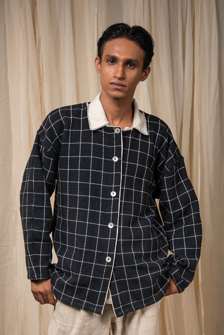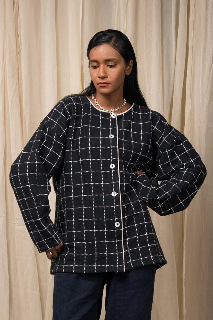 Crafted from 100% cotton fibres and natural materials, this handwoven jacket is made from azo-free dyed cotton in large woven checks. Featuring a round neckline and drop shoulders, it is detailed with Kala Cotton contrast piping. A versatile layer that can be worn open or closed, lending ease and comfort across seasons.