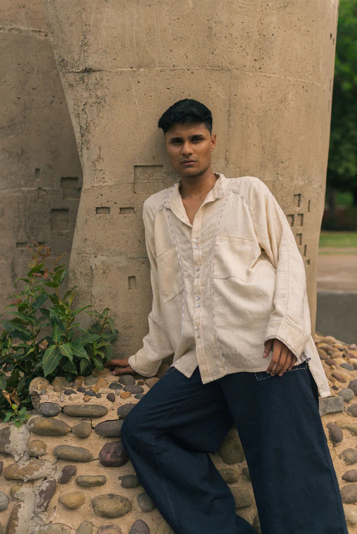 "Made from 100% cotton fibres and natural materials, the Seam Shirt is crafted in undyed and unbleached Kora Kala cotton - a soft, textured fabric that holds the natural character of the fibre. Hand-done Kantha embroidery runs along the seams, complemented by piping in grey striped handwoven cotton, subtly framing the garment’s structure.