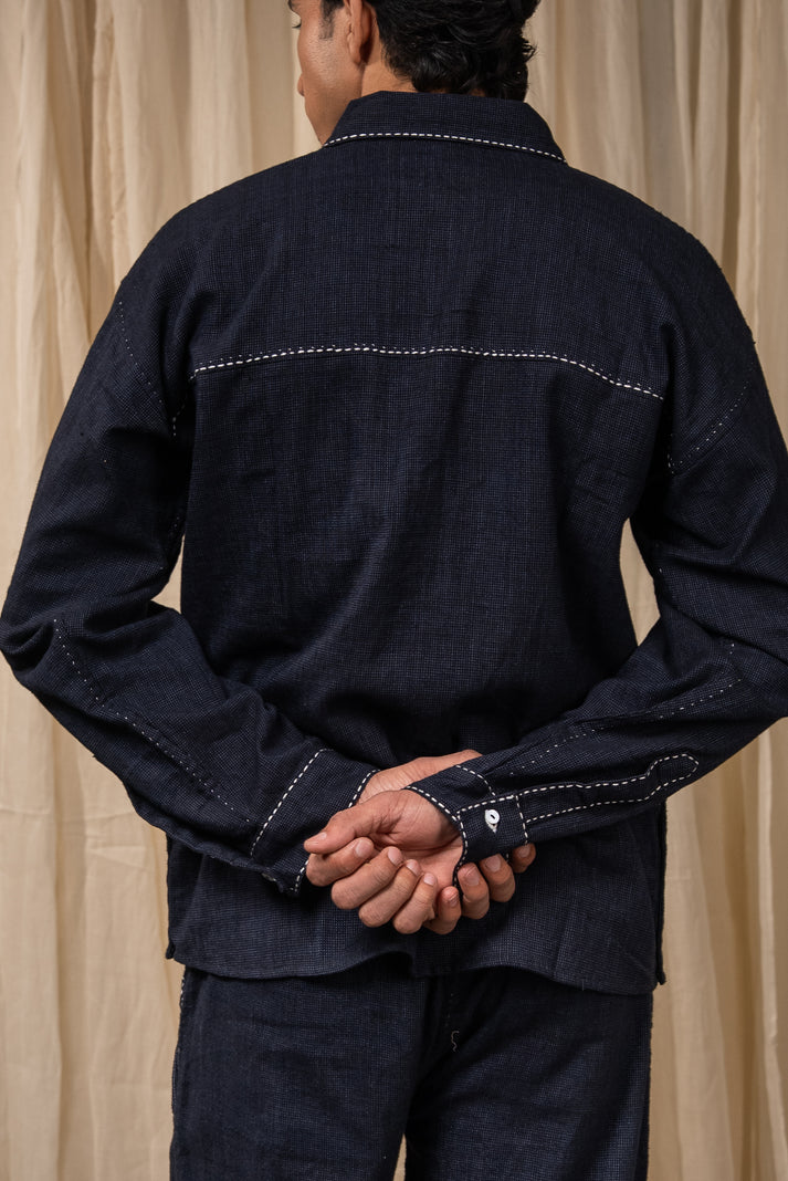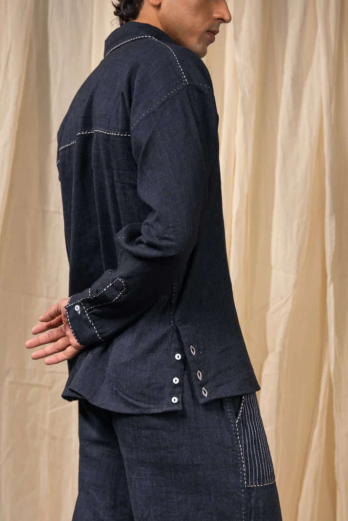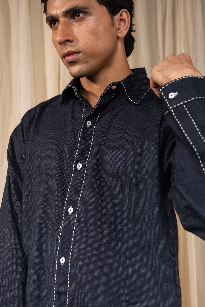 The staple (half) Crafted from 100% cotton fibres and natural materials, this shirt is made from azo-free dyed black handwoven cotton. A classic full-sleeved silhouette is detailed with fine Kantha lines that quietly highlight its form and construction- subtle marks of hand and process. Simple yet versatile, this trans-seasonal piece can be worn on its own or layered with ease.