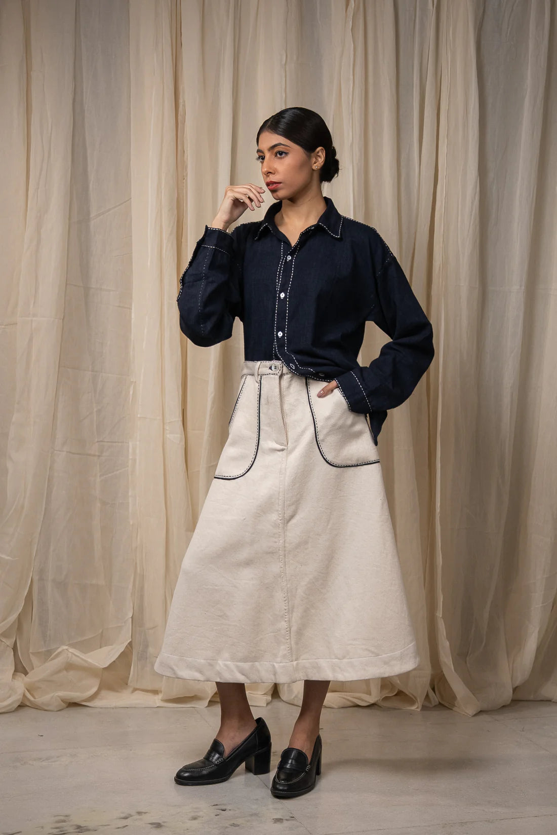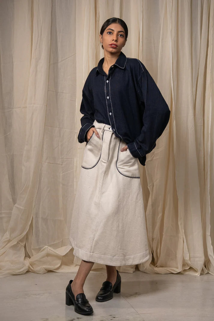 Crafted from 100% cotton fibres in handwoven denim, this skirt features an easy A-line silhouette. Patch pockets are highlighted with fine Kantha embroidery and traced with delicate Chanderi piping. Finished with a front placket and drawstrings at the waist for adjustability.