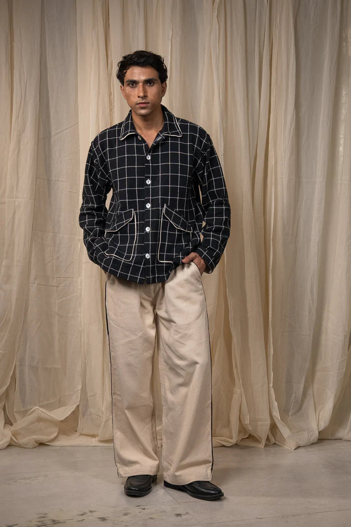 "Crafted from 100% cotton fibres and natural materials, this thick handwoven jacket is made from azo-free dyed cotton in large woven checks. Detailed with undyed Kala Cotton piping, it features patch pockets for utility and foldable cuffs for styling versatility.